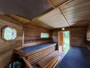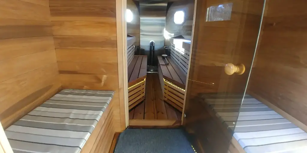Toimiva ilmankierto, premium tason Kerkes kiuaskivet ja IKI JR puulämmitteinen kiuas varmistavat löylyelämyksen onnistumisen. Ledivalot ohjaavat kulkuasi ja löylyn luomista pimeämmissäkin olosuhteissa.